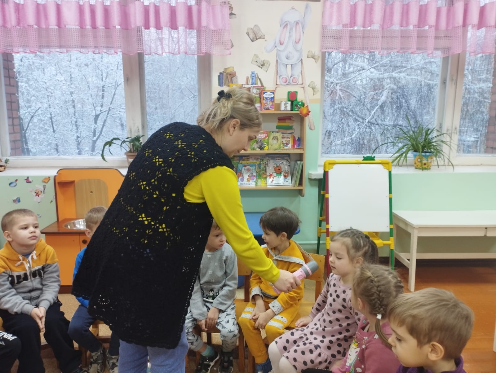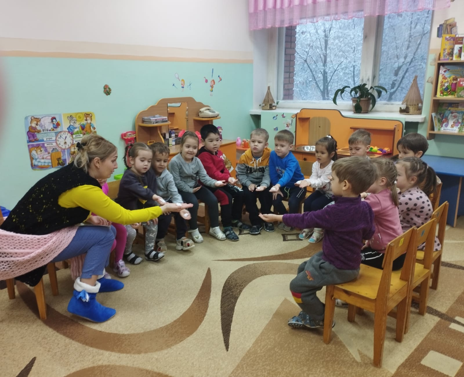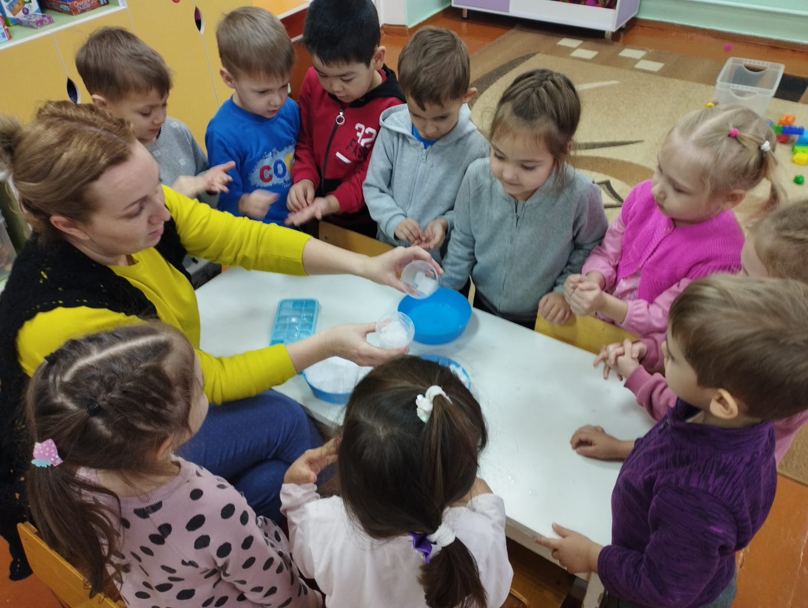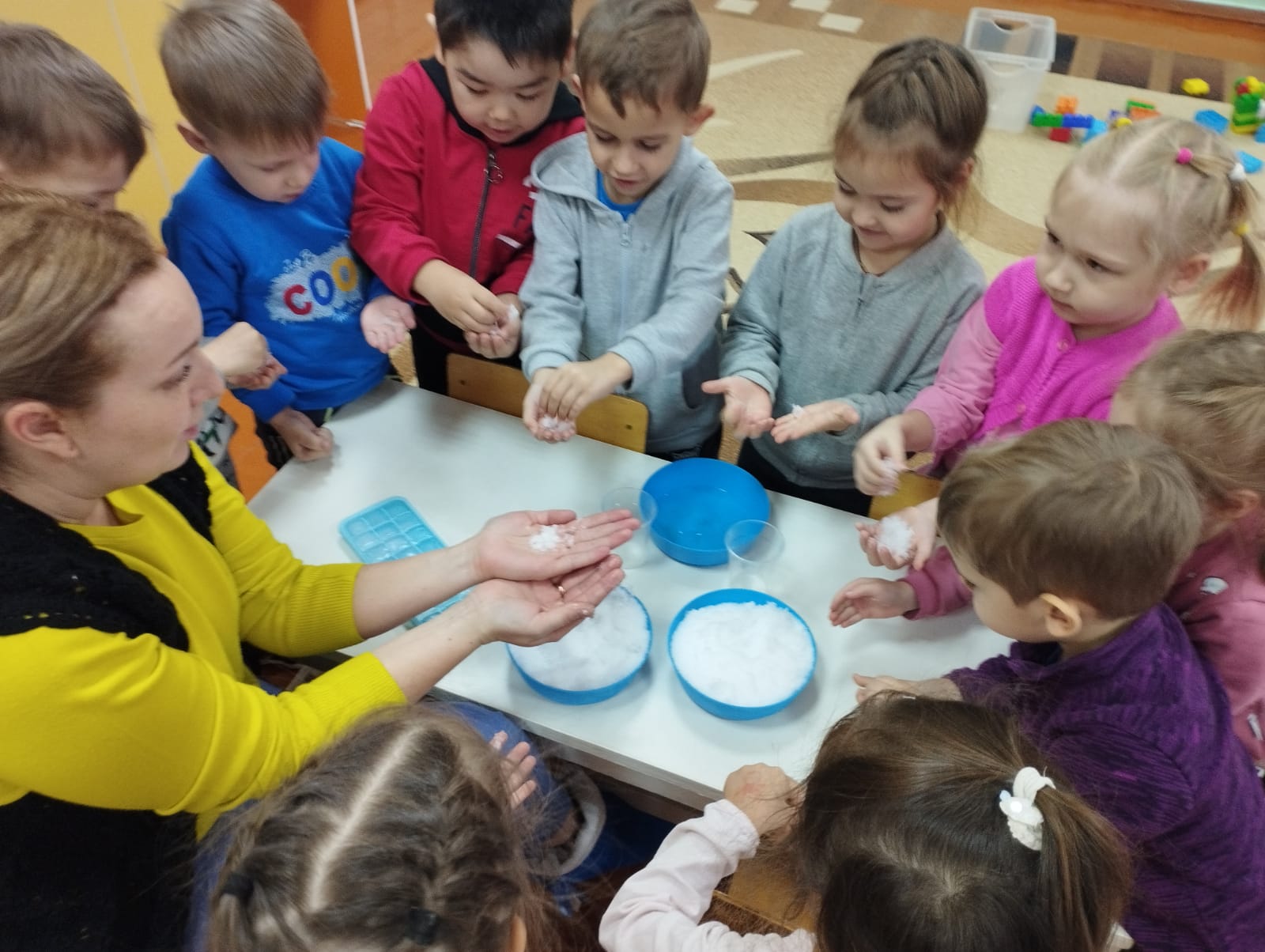 Қатты аязға қарамастан, "Ягодки" ересектер тобындағы апта қызықты өтті. Балалар жоба бойынша жұмысты жалғастыруда, ата-аналарымен бірге шығармашылық тапсырманы орындады. Сондай-ақ, балалар қар адамдарын мүсіндеп, жануарларға арналған үйлер салды. Олар "Снежинкалар" жаңа саусақ гимнастикасын үйренді, "Қыс" тақырыбына жұмбақтар шешті. Аптаның нәтижесі эксперимент болды, онда балалар мұз бен қардың мұздатылған су екенін білді, тек әртүрлі жағдайларда.