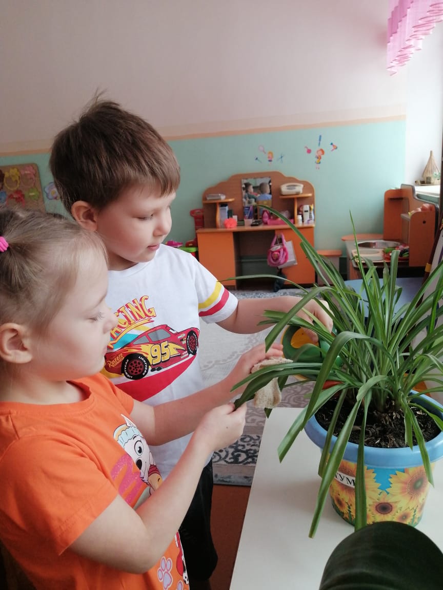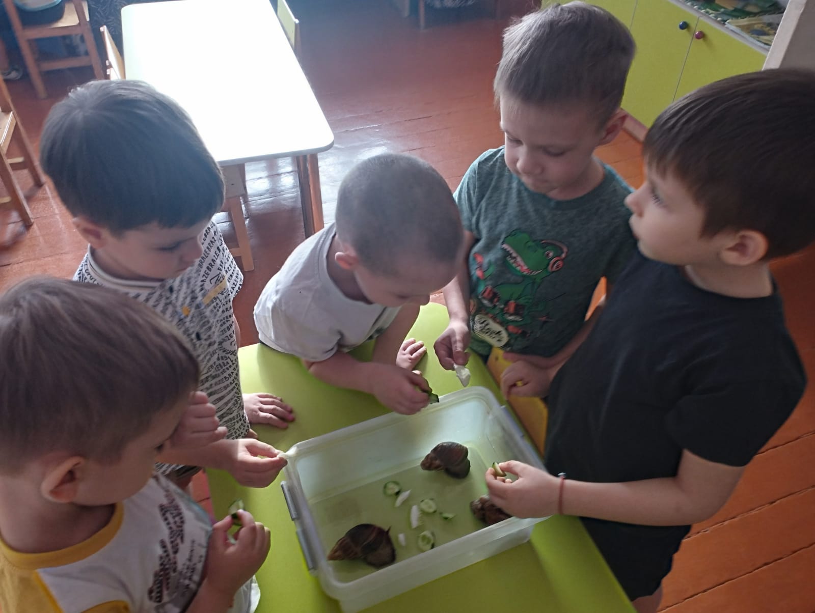 Балалар табиғат бұрышындағы жұмыс туралы да ұмытпайды-олар гүлдерді суарып, сүртеді, балықтар мен құрлық ұлуларын тамақтандырады.