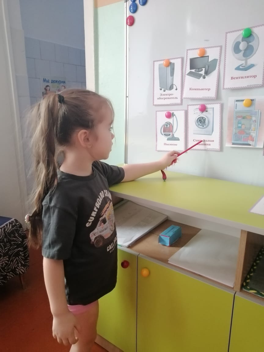 "Қауіпті заттарды тап", "Не болады", "Затты жина" дидактикалық ойындарының көмегімен балалар тұрмыстық электр құрылғылары туралы білімдерін бекітті, олармен қауіпсіздік ережелерін есіне алды.