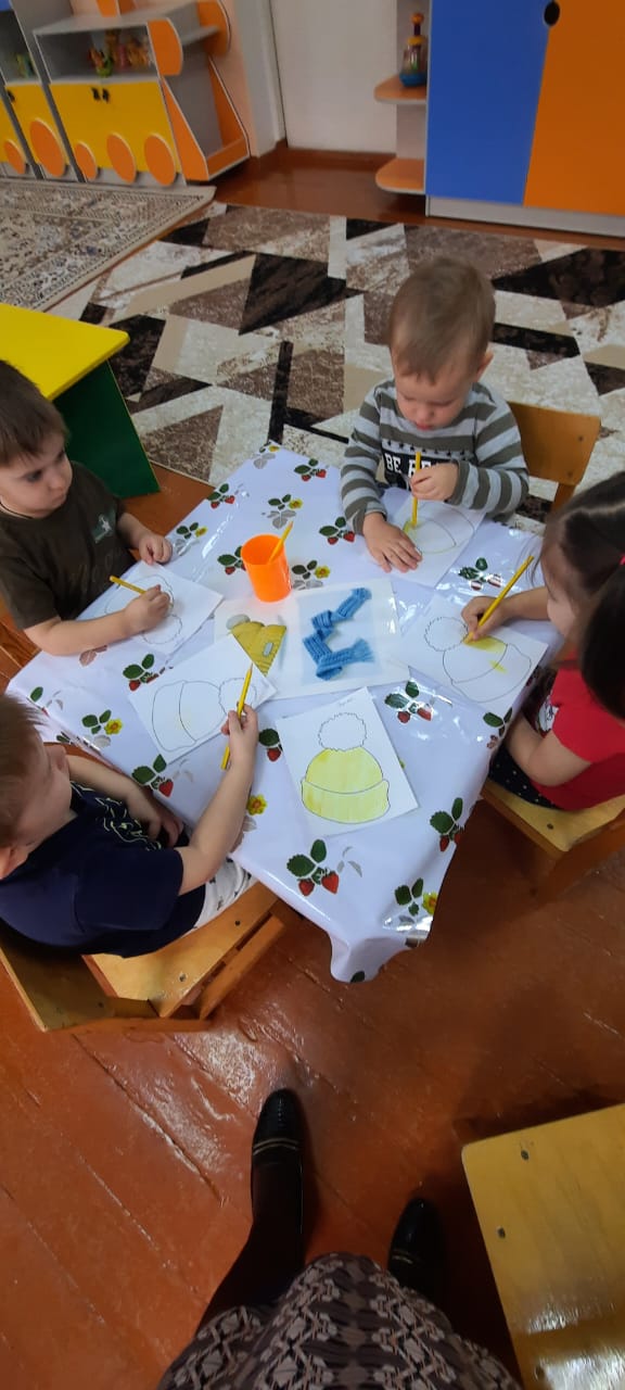Коммуникативтік және танымдық дағдыларды дамыту үшін балалармен: "Қысқы бас киімдер", "Бас киімдер не үшін қажет ", "Бас киімдер қандай" әңгімелесулер өткізілді;"Бас киімдерді Атамекен ", "Пирамиданы жина ", "Түрлі мамандықтарға арналған Бас киімдер" ойындарын ойнады; қазақ ұлтының бас киімдерін зерттеді - бас сүйегі.