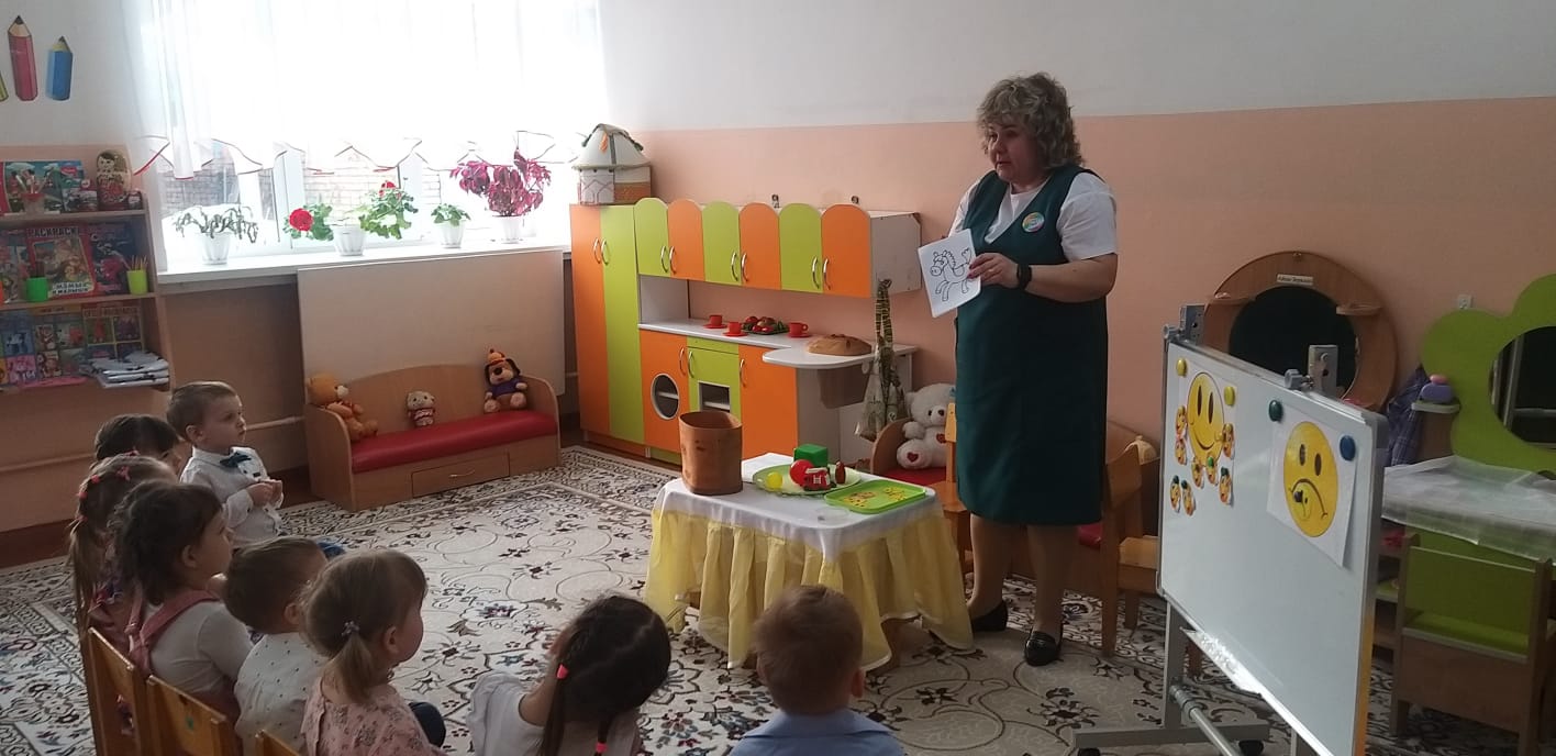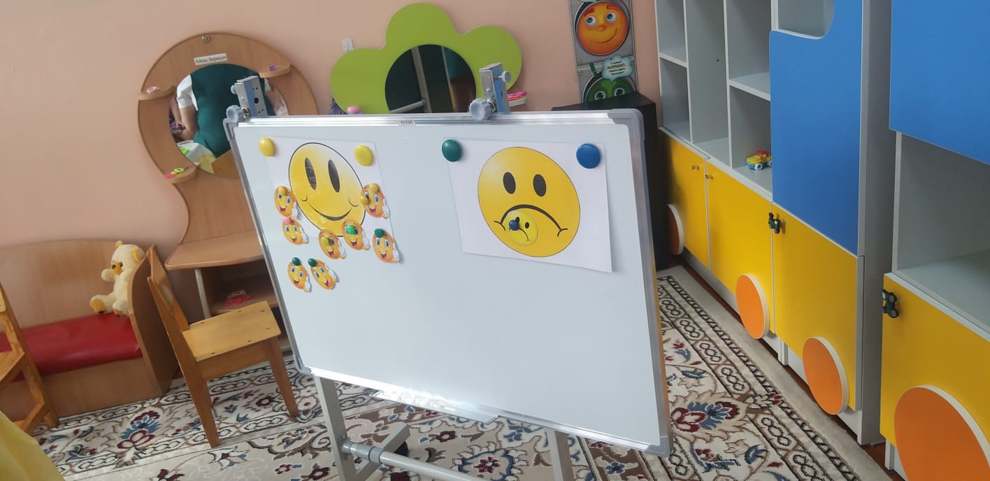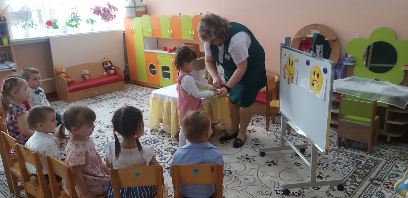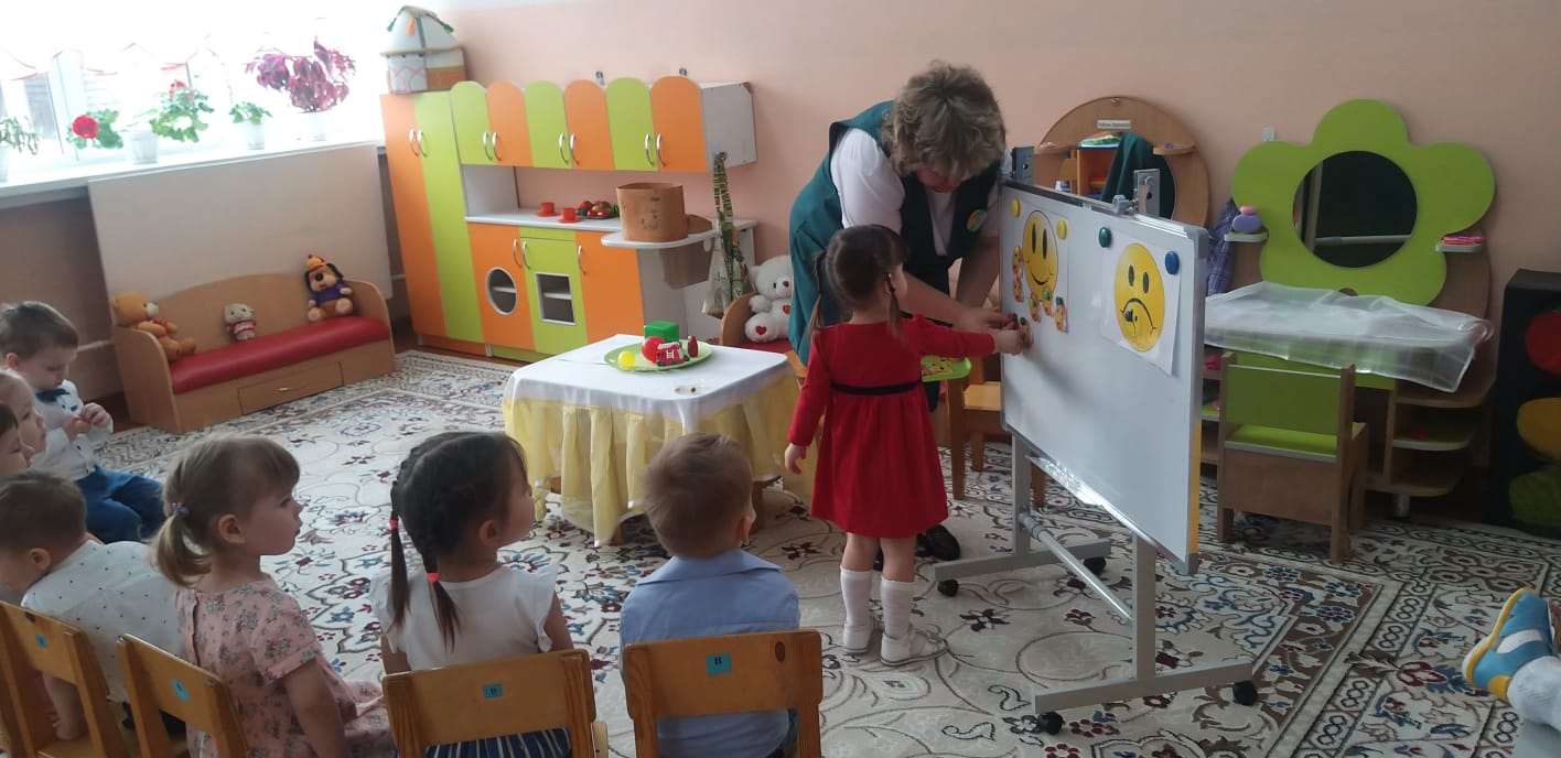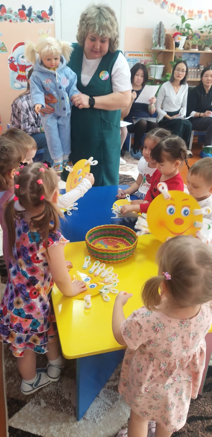 Кішкентай балаларға қызықты, қол жетімді және түсінікті материал беру, тиімді формалар мен әдістерді қолдану қызығушылықты, танымдық қызығушылықты және тапсырмаларды орындауға деген ұмтылысты ынталандырды: Катя қуыршақ ойыншықтар салынған қорапты әкелді - " Сиқырлы қорап "(Storisek технологиясы) - балаларды ынталандыру үшін қолданды, қораптағы балалар ойыншықтарды алып келді, оларды атады "Керемет қап" - балаларды 2 топқа бөлуге көмектесті," Көңілді киім қыстырғыштары " - қолдың ұсақ моторикасын дамыту үшін қолданды, "Қайғылы және көңілді смайлик" - балалар өздерінің көңіл-күйлерін анықтады (рефлексия). Мұғалім балаларды ұйымдастырудың жеке және топтық формасын қолданды, балаларға тапсырмалар мен жаттығуларды әр түрлі формада орындауға көмектесті – сұрақтар туғызатын кеңестер. Сабақтың басында қойылған мақсатқа қол жеткізілді, міндеттер толық көлемде іске асырылды. Ойын барысында балалар Белсенді, Мұқият болды және сұрақтарға жауап берді.