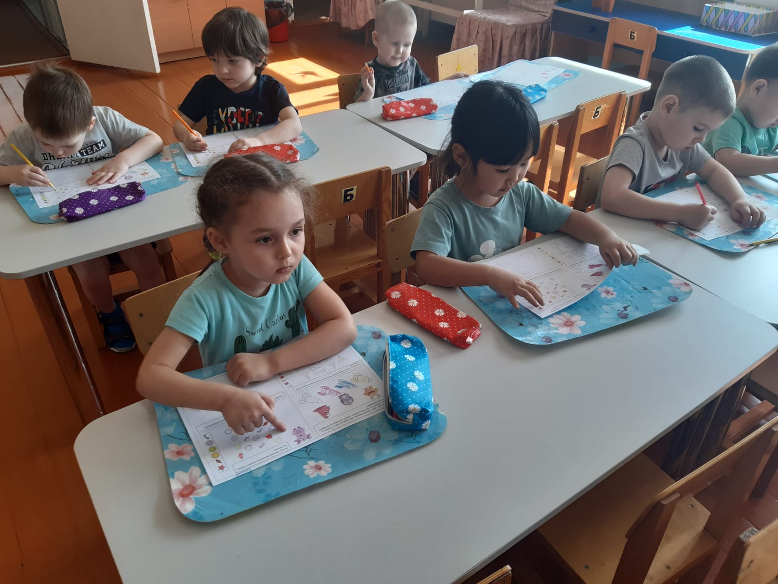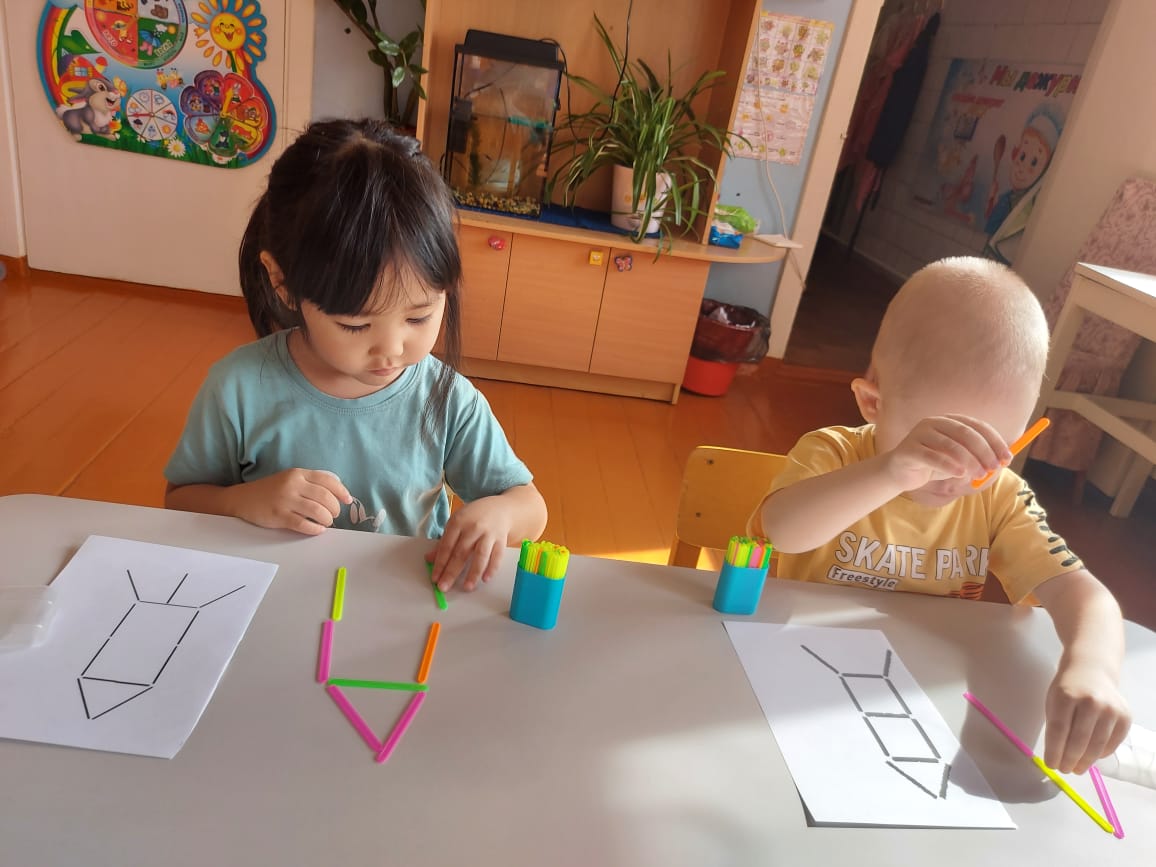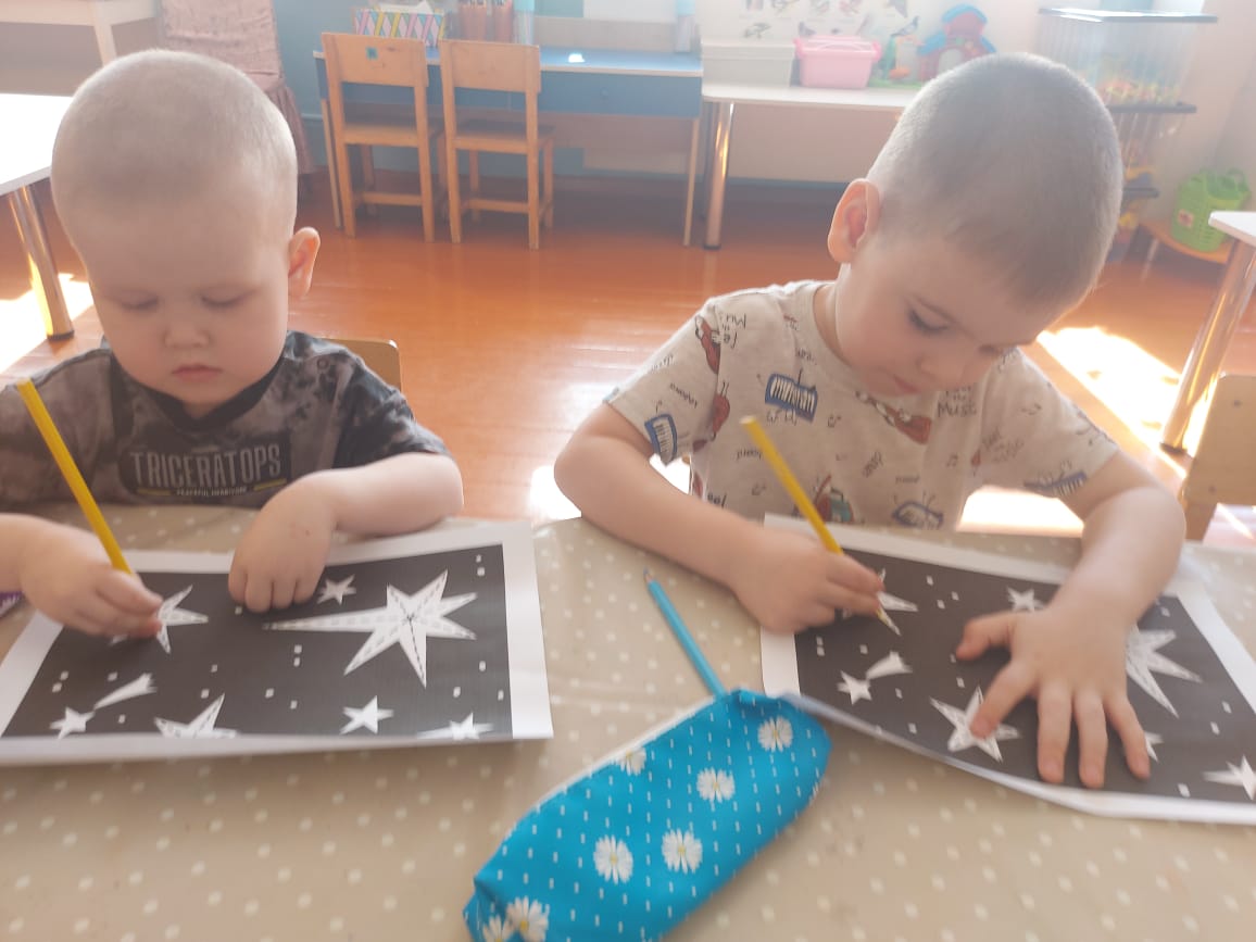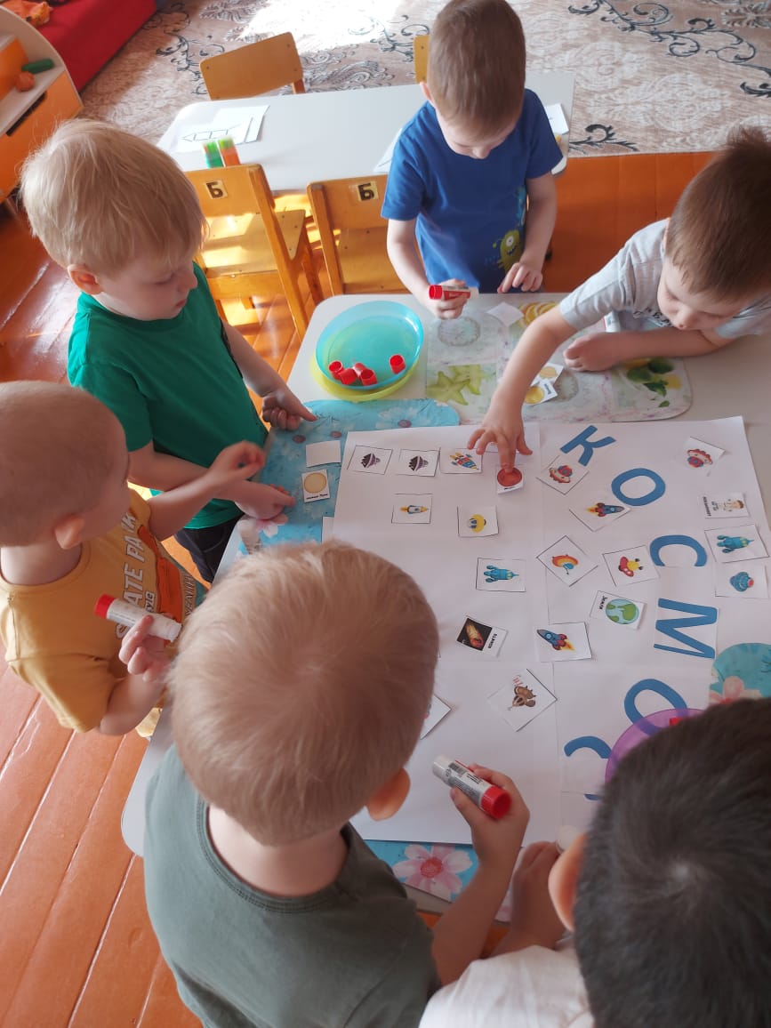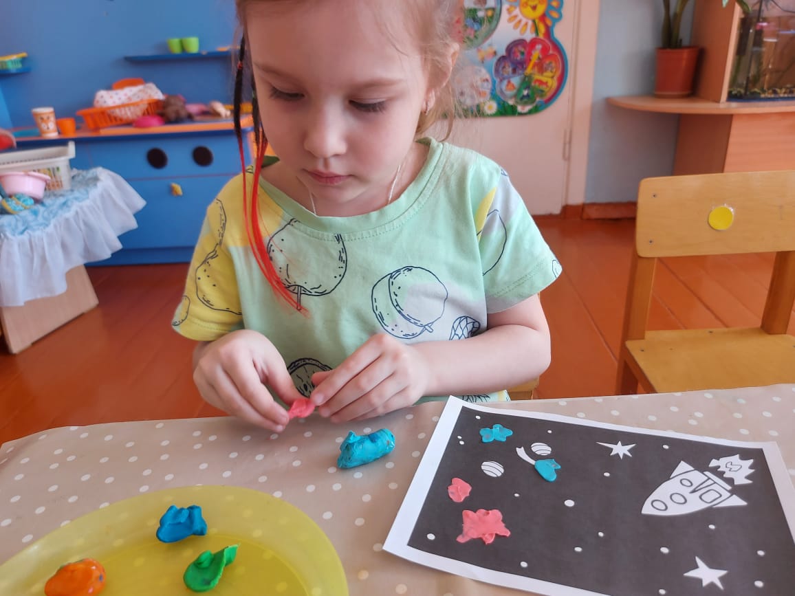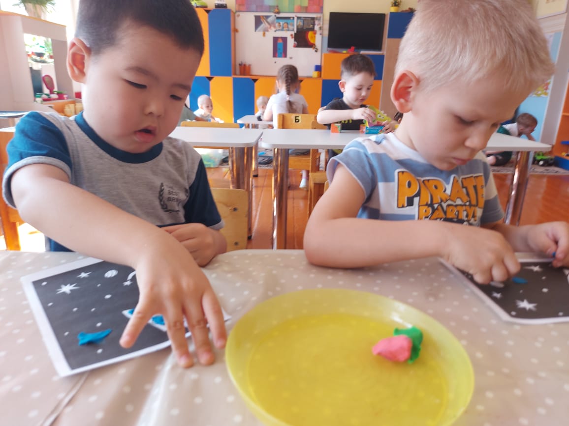 Балалар ғарыш туралы алған білімдерін өздерінің шығармашылық жұмыстарында бекітті: "Жұлдызды аспан" суреті; "Ғарыш" тақырыбы бойынша бояулармен жұмыс, "Ғарышқа ұшу" пластилинографиясы, "Зымыран" мүсіні, геометриялық фигуралардан - "Зымыран" аппликациясы, балалар ғарыштың ашық кеңістігіне өздері барғандай болды. Математикадан оқушылар әртүрлі планеталар туралы білуге өте қызықты болды. Біз ұқсастықтар мен айырмашылықтарды табуды, планеталардың түсін, пішінін, шамасын бөлектеуді үйрендік. Санау материалымен жұмыс: санау таяқшаларының үлгісі бойынша "Зымыранды" төсеу.