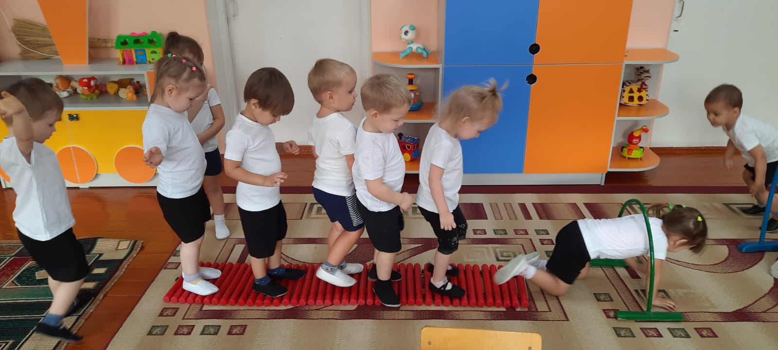 Дене шынықтыру сабағында олар қабырға тақтасында жүрді, доғаның астына көтерілді.