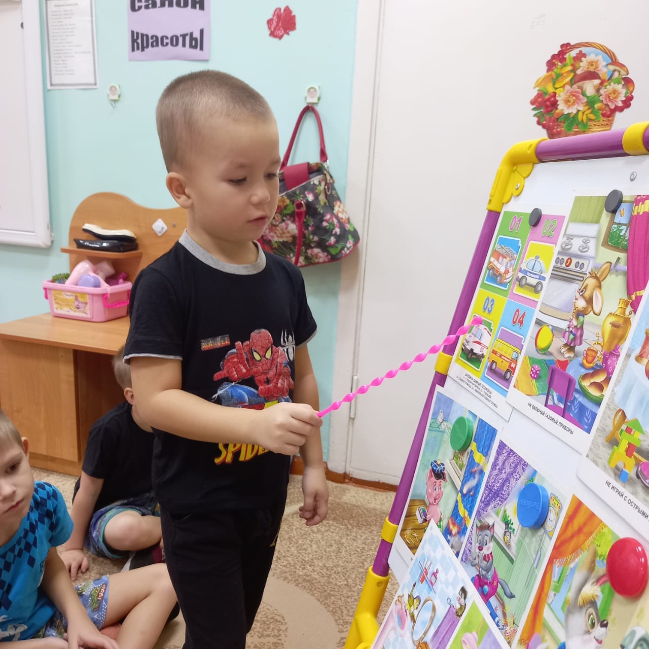 Балалар үйде жүріс-тұрыс ережелерін бекітті, егер олар жалғыз қалса, көшені қалай және қайдан өтуге болатынын есіне алды. Олар "әрекетті бағала", "рұқсат белгілерін ал"үстел ойындарын ойнады. Олар "бағдаршам" қосымшасын орындады, "жақсы жарық"суретін салды. Алғашқы медициналық көмек көрсетуді үйренді. Арнайы көлік туралы еске түсірдік.