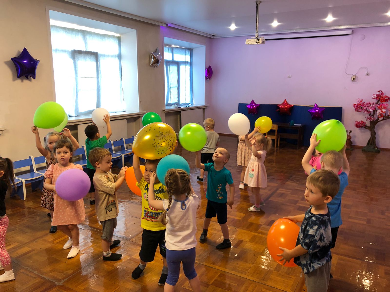 "Көңілді ойындар мен көңілді" тақырыптық апталығы аясында 09.06 аптаның соңғы күні "Солнышко" тобында "кемпірқосақ күні" деген атпен өтті - Күні бойы балаларға әуе шарларымен көңілді ойындар ұсынылды. Көңілді және көңілді ойын-сауық өтті "қала үстіндегі шарлар" онда балалар шарлармен қуана ойнады. Әуе шарларында сурет салу байқауы өткізілді. Мереке соңында балабақшаның үстінде түрлі-түсті кемпірқосақ ұшып кетті. Күн көңілді және нәтижелі өтті. (коммуникативті және ойын дағдыларын дамыту).