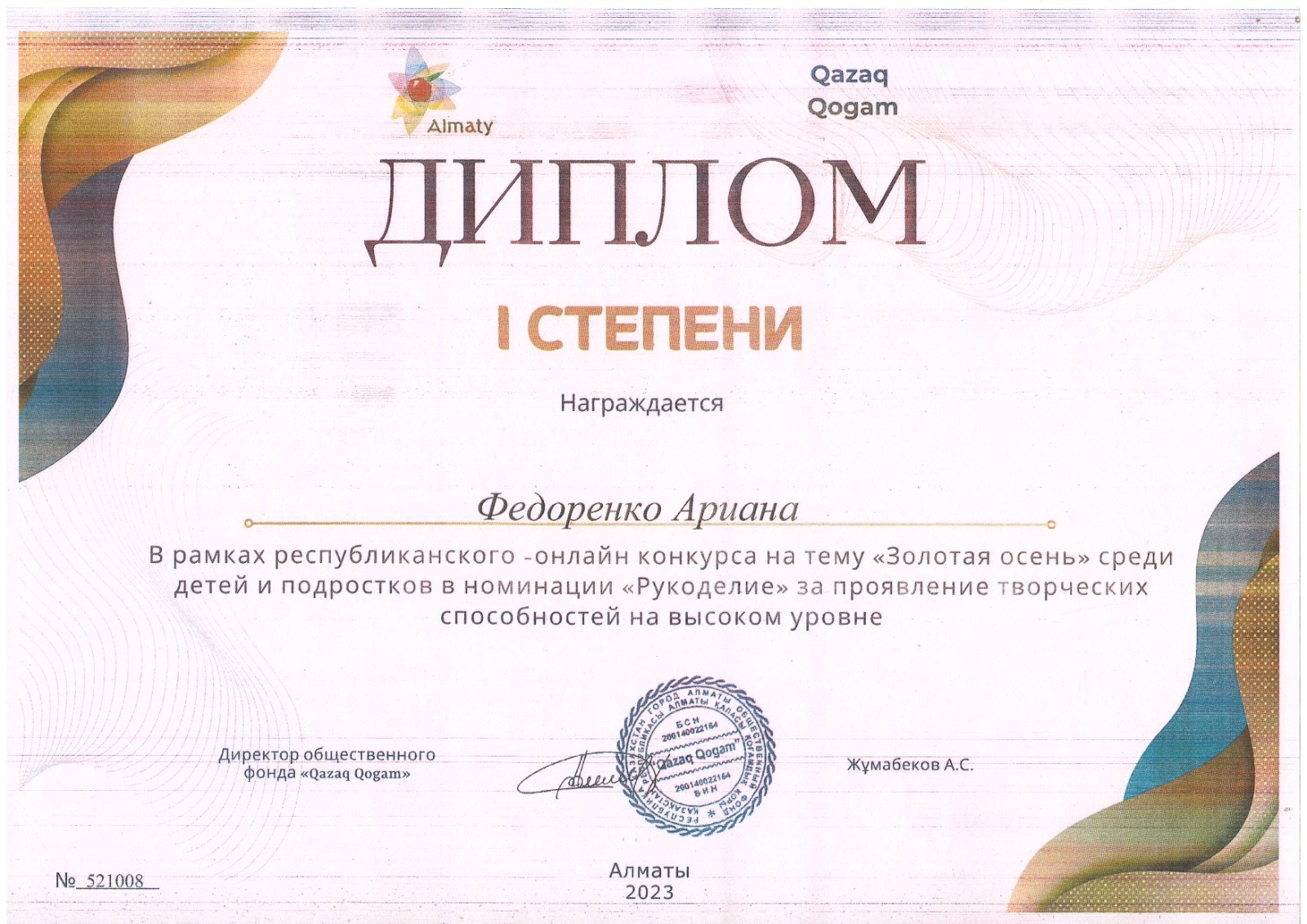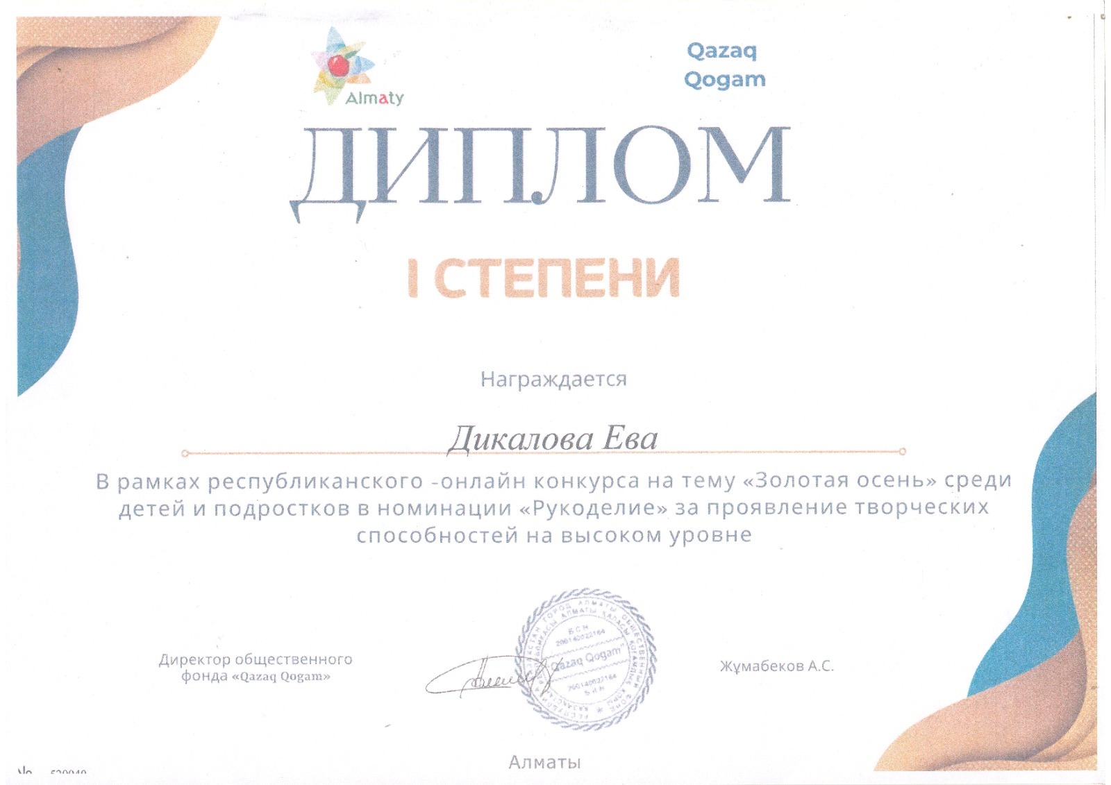 №10 "Колокольчик" балабақшасының тәрбиеленушілері-Дикалова Ева және Федоренко Ариана "Алтын күз" республикалық байқауы аясында Қоғамдық Қоры ұйымдастырған "Қолөнер" номинациясына қатысып, шығармашылық қабілеттерін жоғары деңгейде көрсеткені үшін 1 дәрежелі диплом - жүлделі орындарға ие болды деңгейінде!!! Қоғамдық қор педагогтарға А. В. Невзорова мен А. В. Хлыновскаяға алғысын білдіреді.. Құттықтаймыз.