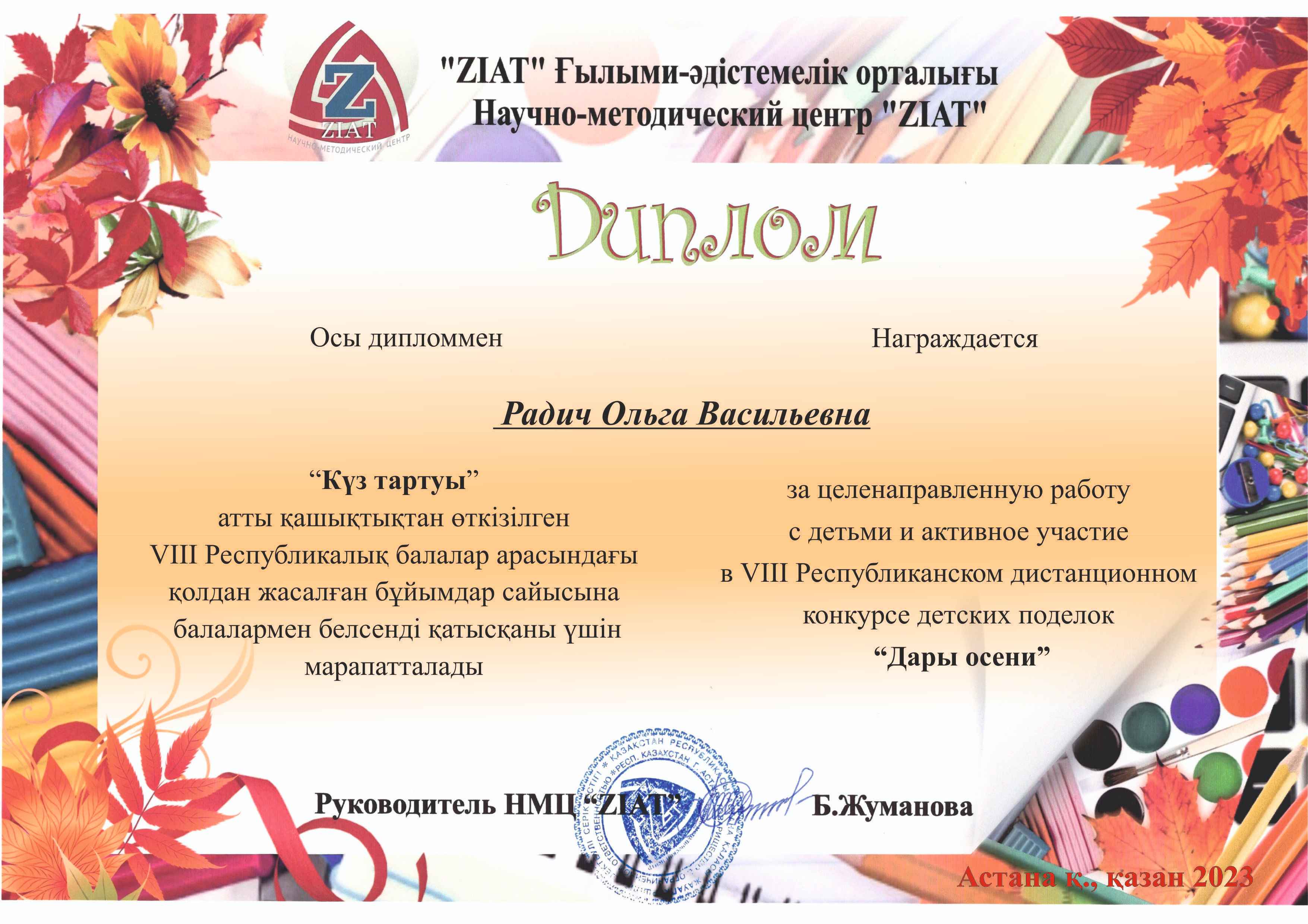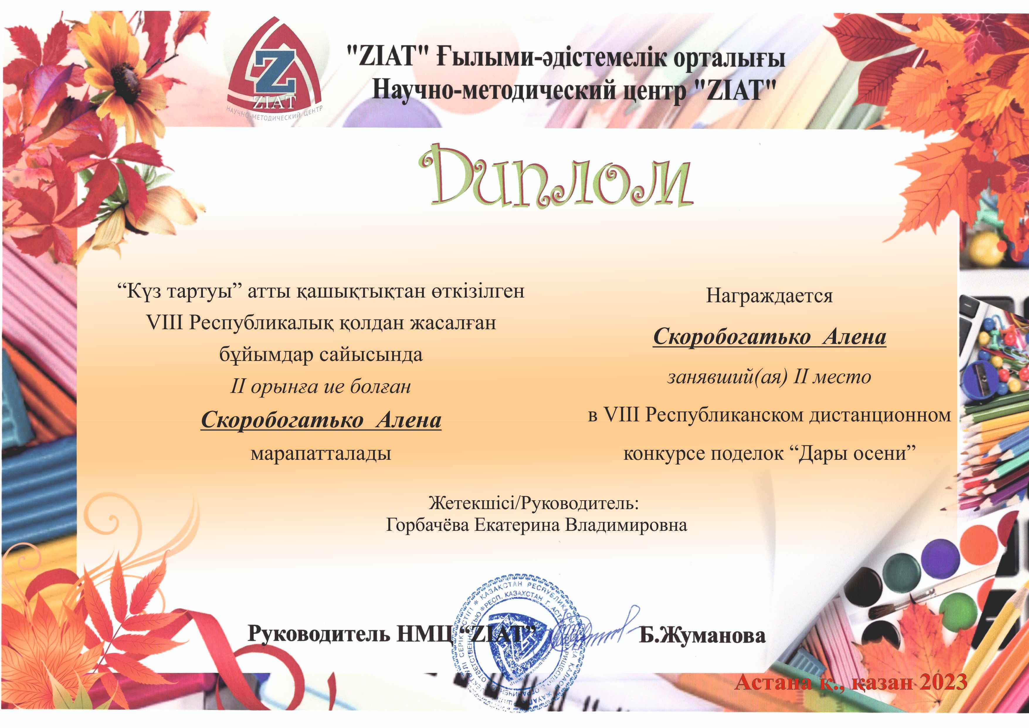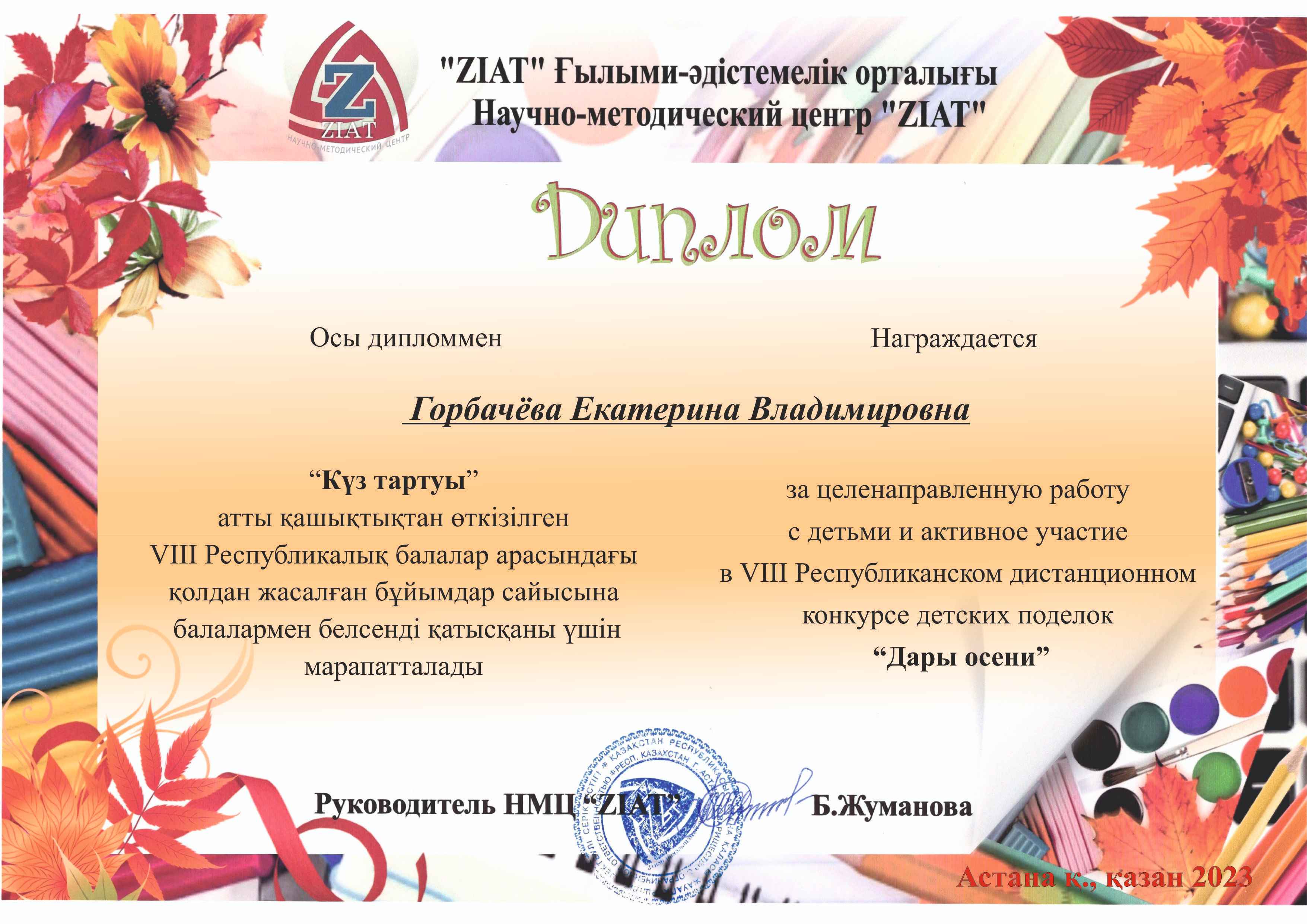 "ZIAT" ғылыми-әдістемелік орталығы Ұйымдастырушы болып табылатын VIII Республикалық "Күз сыйлықтары" қолөнер байқауы аясында №10 "Колокольчик" балабақшасының тәрбиеленушілері белсенді қатысып, жүлделі орындарға ие болды: Гончар София-Диплом I орын, Скоробогатько Алена және Тумашова Виктория - дипломдар II орын, Звонцов Данил-Диплом III орын!!! Балалармен мақсатты жұмыс істегені және байқауға белсенді қатысқаны үшін педагогтар О. В. Радич пен Е. В. Горбачева дипломдармен марапатталды!!! Құттықтаймыз!!!