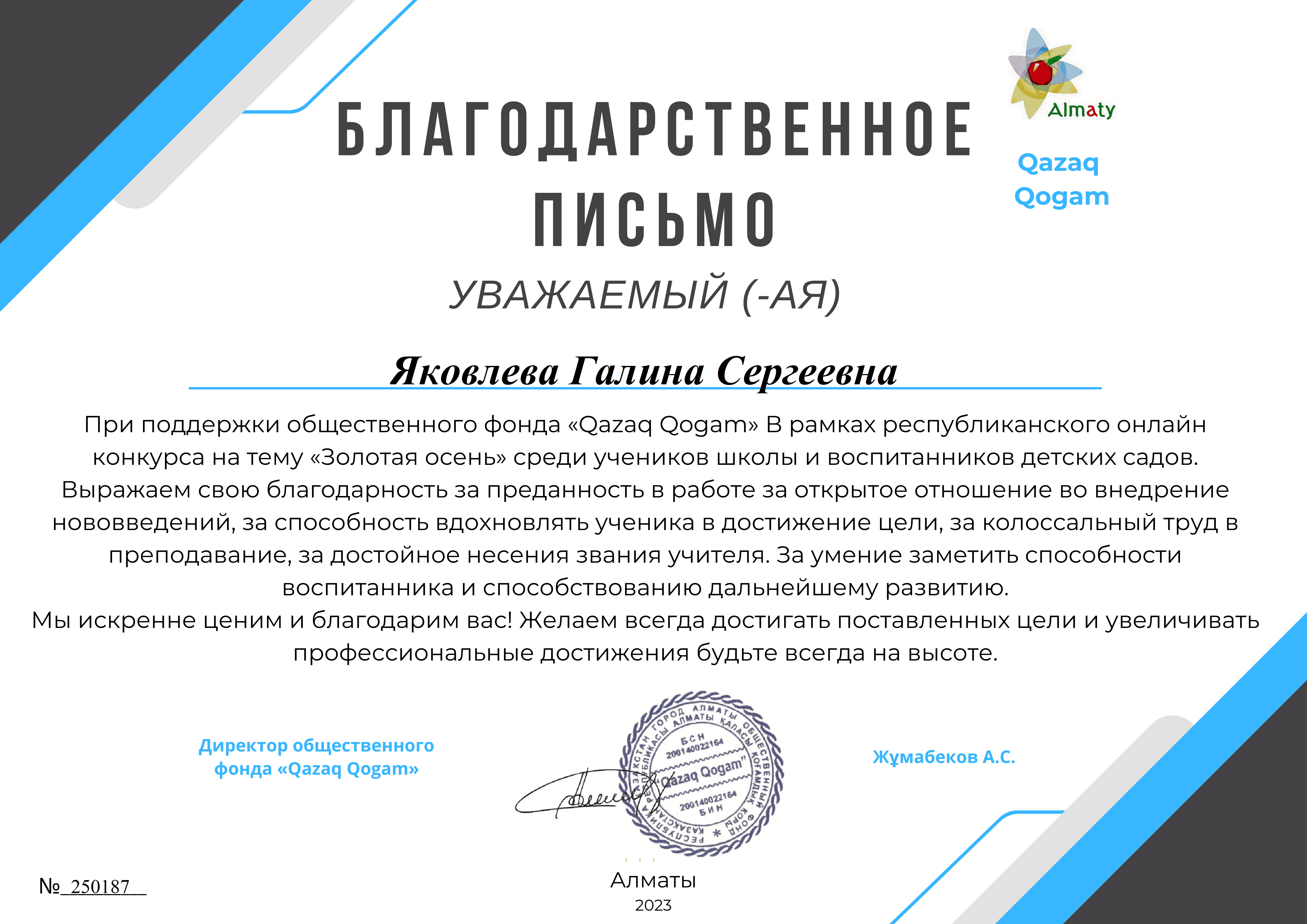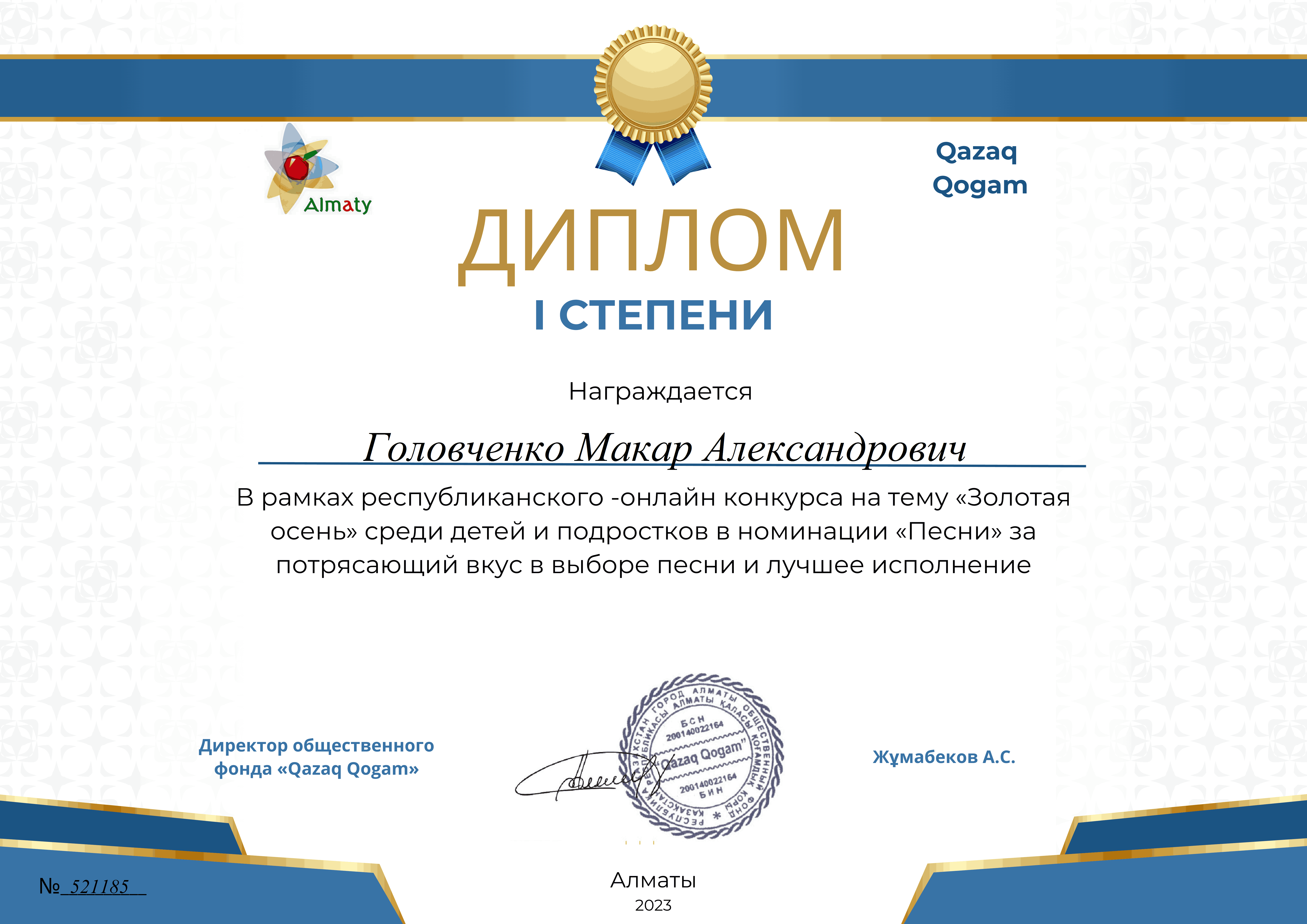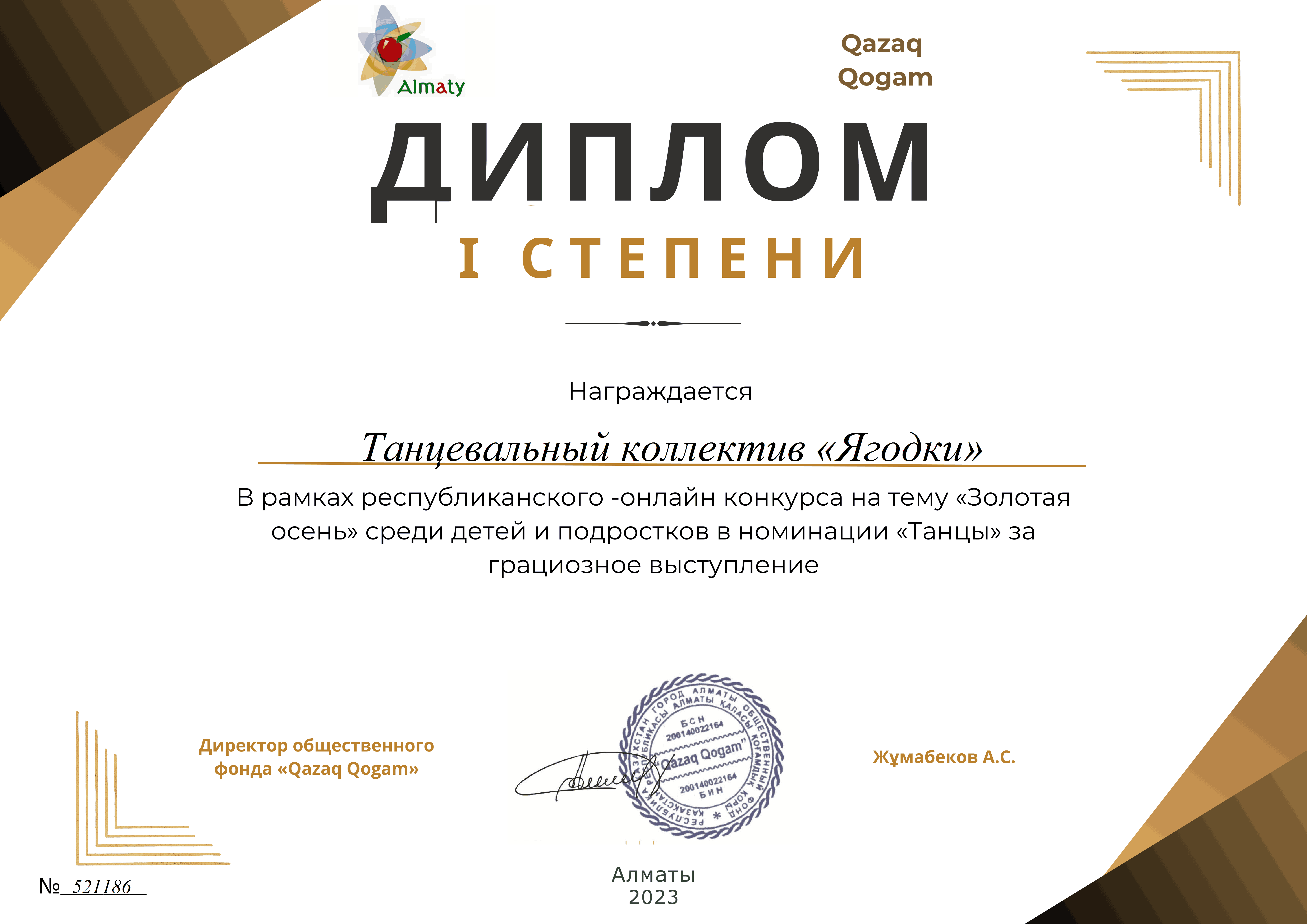 "Qazaq Qogam "қоғамдық қоры Ұйымдастырушысы болып табылатын "Алтын күз" республикалық байқауы аясында №10 "Колокольчик" балабақша-бөбекжайының тәрбиеленушілері 1 дәрежелі дипломдарға қатысты және жүлделі орындарға ие болды: Разуменко Назар" мәнерлеп оқу "номинациясында - шебер оқығаны және орындаудың жоғары көркемдік деңгейі үшін, "Ягодки" би ұжымы - "би" номинациясы бойынша-Әсем өнер көрсеткені үшін, Головченко Макар, "әндер" номинациясы бойынша-үздік орындағаны үшін, "Ложкари" оркестрі - ерекше таланты бар музыкалық аспапта өнер көрсеткені үшін!!! Қоғамдық қор мұғалімдер Е. и. Мехнина, А. Е. Прокуророва және Г. С. Яковлеваға алғысын білдіреді.. Құттықтаймыз!!!