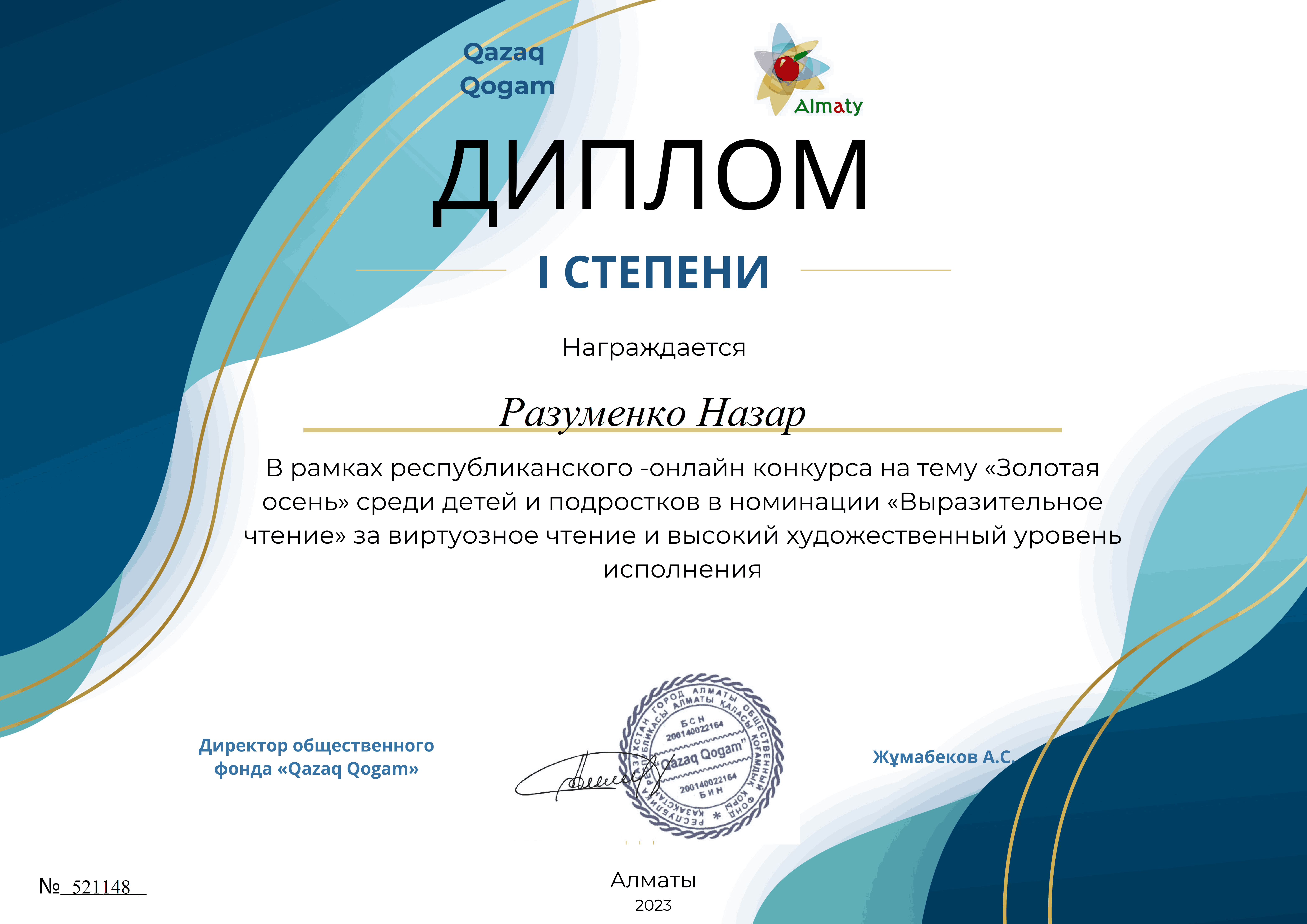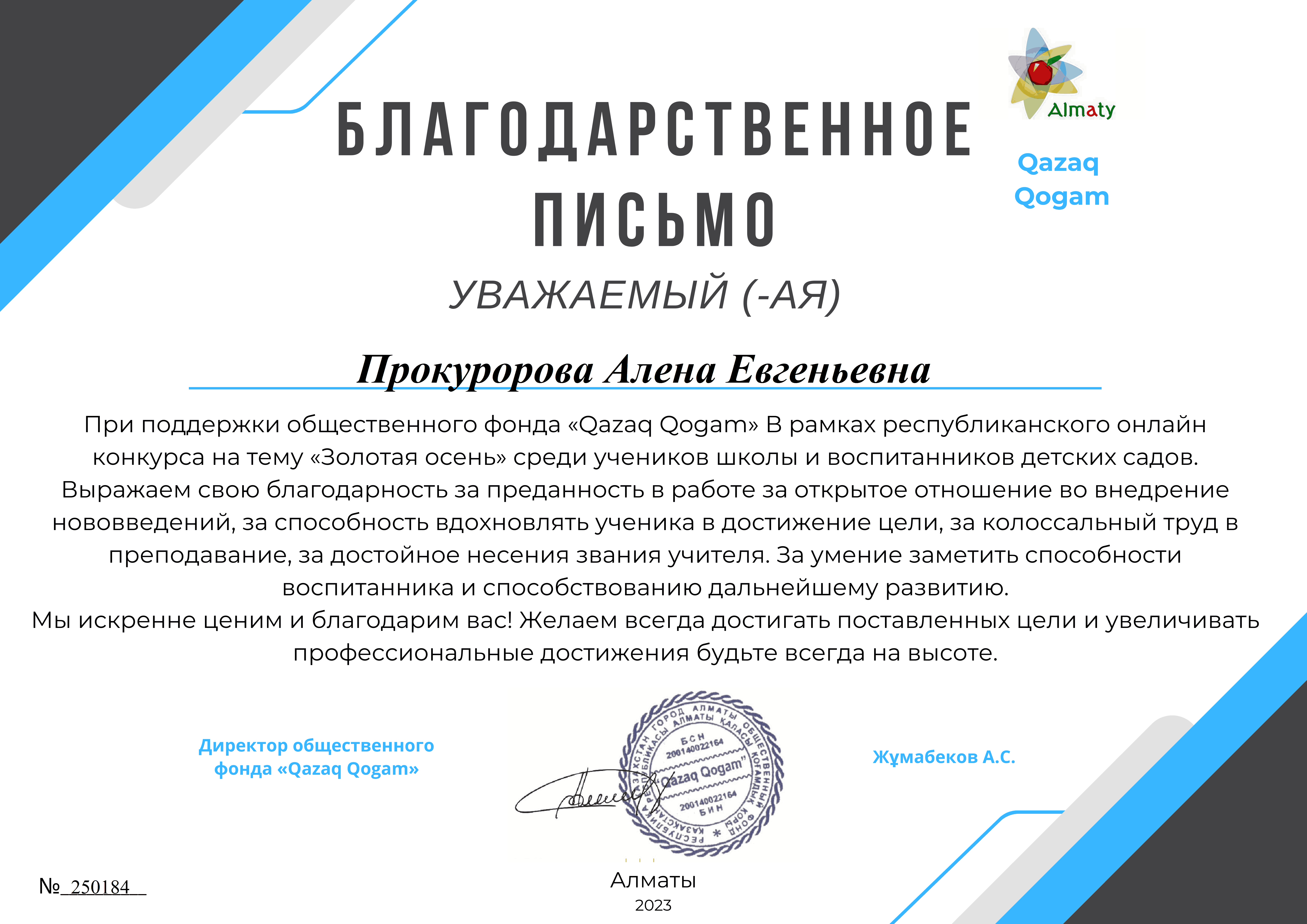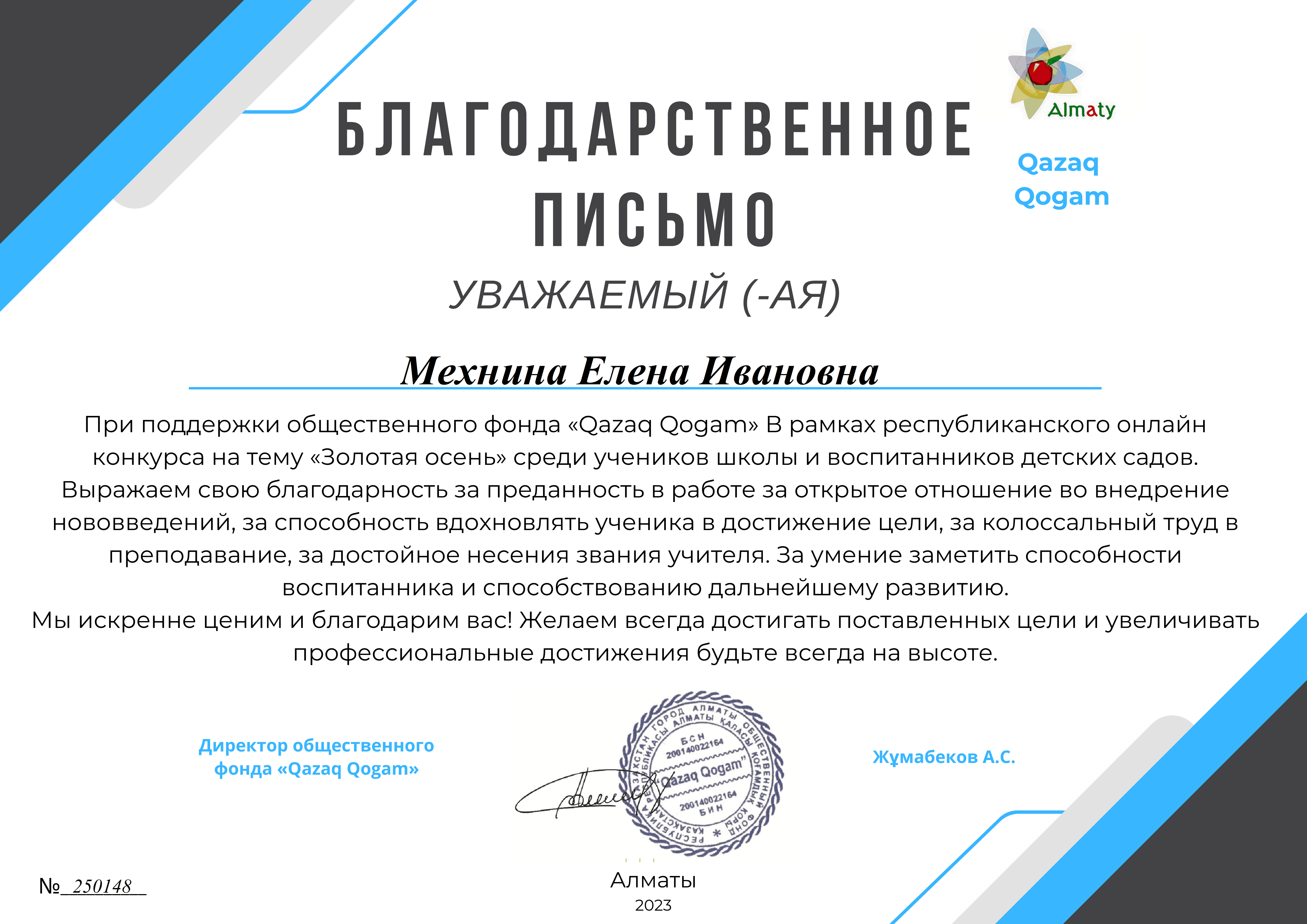 "Qazaq Qogam "қоғамдық қоры Ұйымдастырушысы болып табылатын "Алтын күз" республикалық байқауы аясында №10 "Колокольчик" балабақша-бөбекжайының тәрбиеленушілері 1 дәрежелі дипломдарға қатысты және жүлделі орындарға ие болды: Разуменко Назар" мәнерлеп оқу "номинациясында - шебер оқығаны және орындаудың жоғары көркемдік деңгейі үшін, "Ягодки" би ұжымы - "би" номинациясы бойынша-Әсем өнер көрсеткені үшін, Головченко Макар, "әндер" номинациясы бойынша-үздік орындағаны үшін, "Ложкари" оркестрі - ерекше таланты бар музыкалық аспапта өнер көрсеткені үшін!!! Қоғамдық қор мұғалімдер Е. и. Мехнина, А. Е. Прокуророва және Г. С. Яковлеваға алғысын білдіреді.. Құттықтаймыз!!!