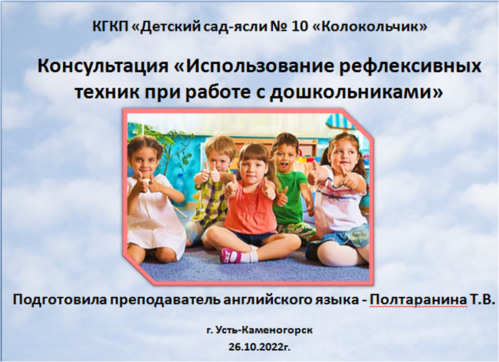 Педагоги КГКП «Детский сад-ясли №10 «Колокольчик» отдела образования по городу Усть-Каменогорску управления образования ВКО, провели консультации для педагогов в рамках подготовки к педсовету №3 «Интеграция образовательных областей как форма организации целостного процесса в дошкольной организации». Преподаватель английского языка Полтаранина Т.В. выступила с темой: «Использование рефлексивных техник при работе с дошкольниками», воспитатель Невзорова А.В. – тема: «О развивающем обучении».