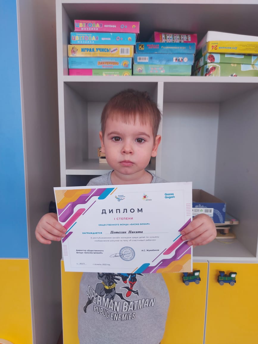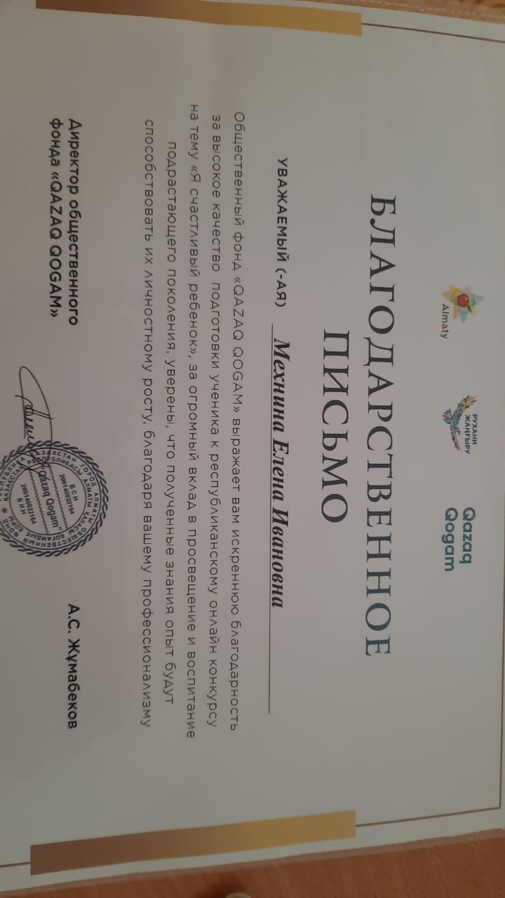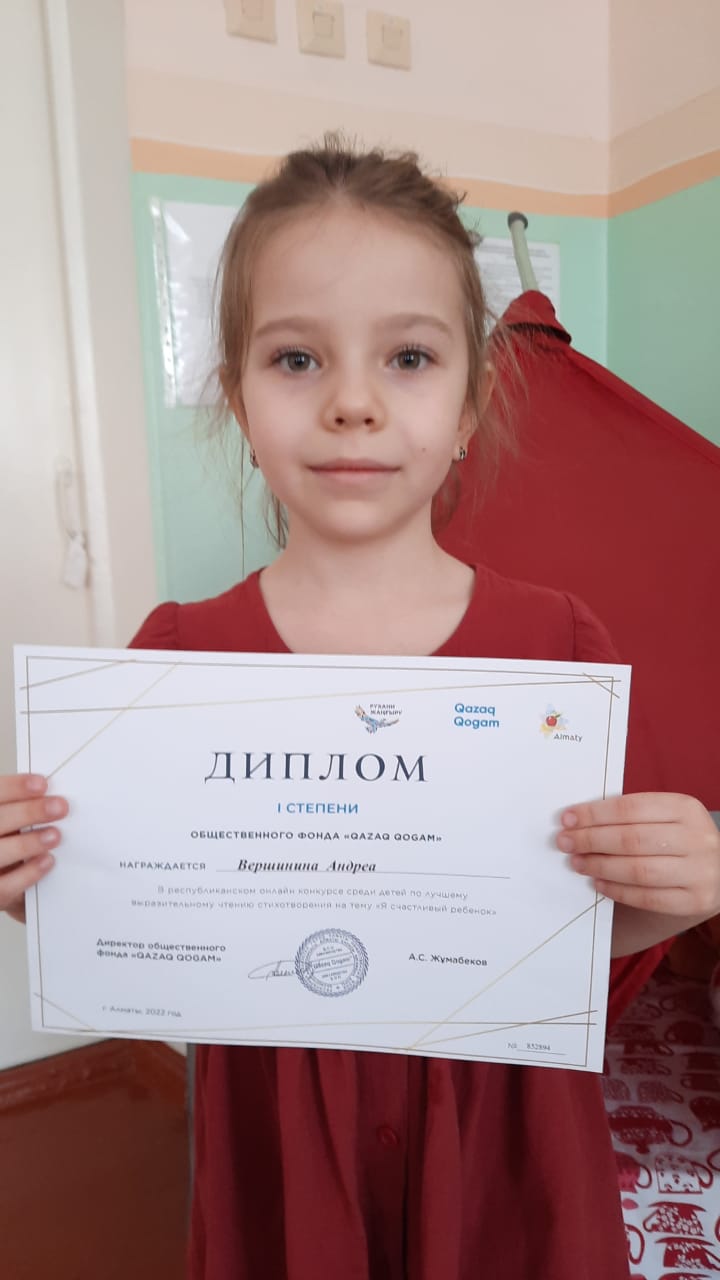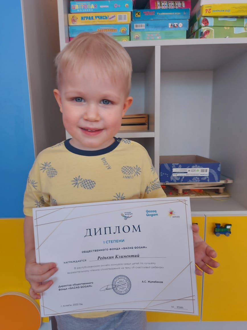 Воспитанники детского сада «Колокольчик» приняли участие в республиканском онлайн конкурсе среди детей по лучшему выразительному чтению на тему «Я счастливый ребенок». Дети получили дипломы 1 степени, а воспитателям Мехниной Е.И., Путиной О.Р., Кирьяновой А.В. общественный фонд «Qozaq Qogam» выразил искреннюю благодарность за высокое качество подготовки детей к конкурсу. ПОЗДРАВЛЯЕМ!!!
