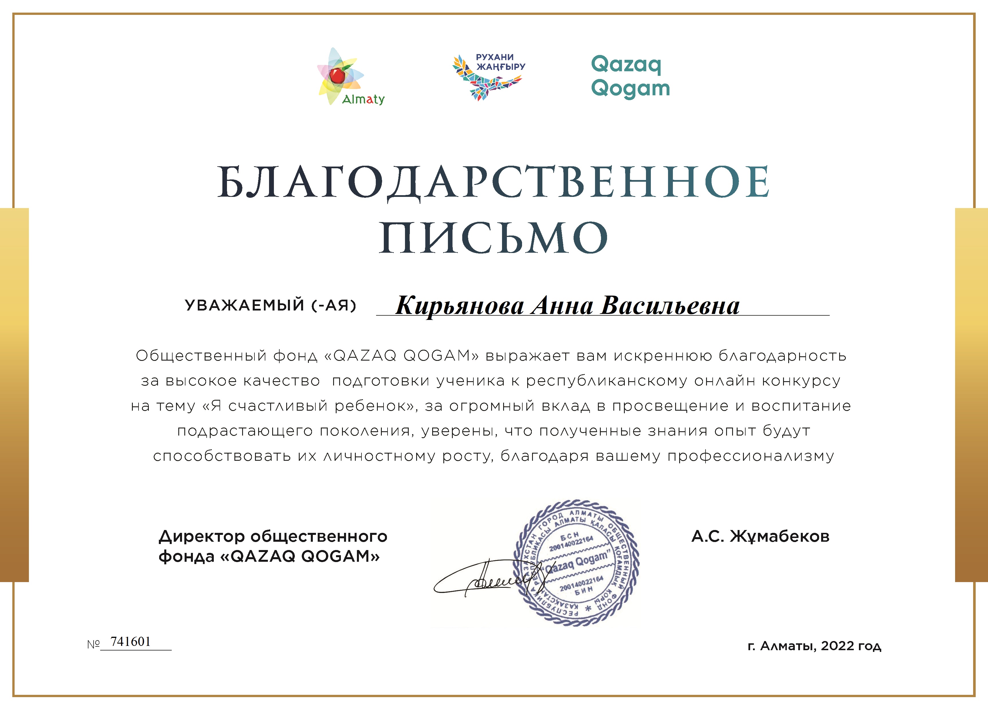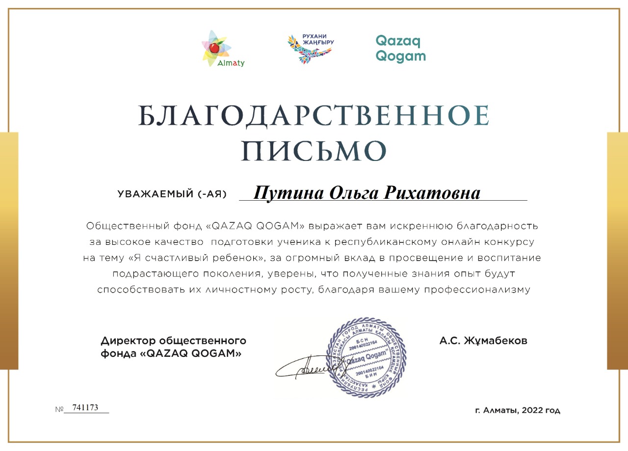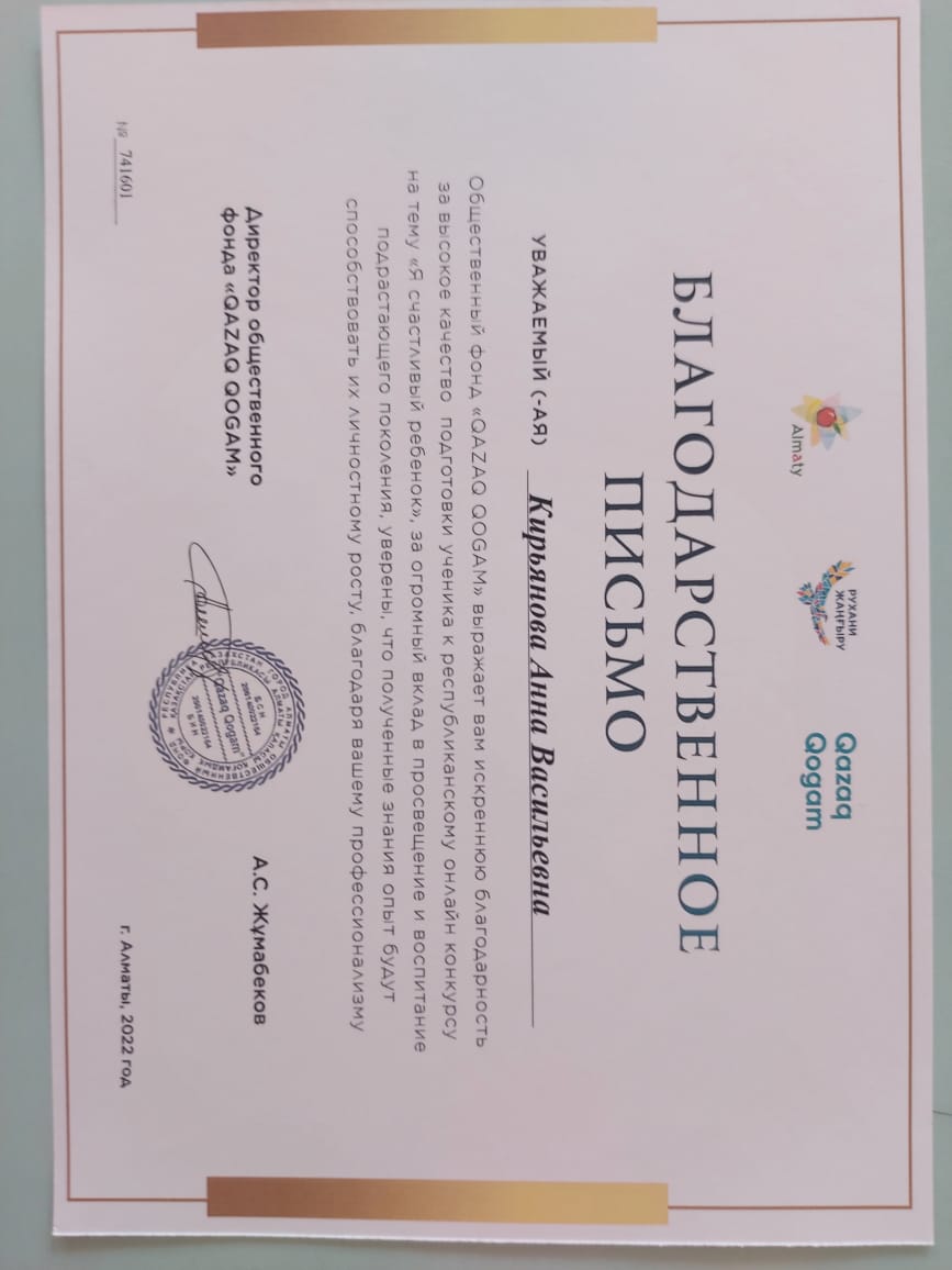 Воспитанники детского сада «Колокольчик» приняли участие в республиканском онлайн конкурсе среди детей по лучшему выразительному чтению на тему «Я счастливый ребенок». Дети получили дипломы 1 степени, а воспитателям Мехниной Е.И., Путиной О.Р., Кирьяновой А.В. общественный фонд «Qozaq Qogam» выразил искреннюю благодарность за высокое качество подготовки детей к конкурсу. ПОЗДРАВЛЯЕМ!!!